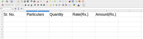 i2C > File > Tabulating Bill: 1-Prepare Sheet > Preparing spreadsheet structure for data entry: For tabulating the data from a given sample bill, lets take follwing steps: Open a spreadsheet. Save the spreadsheet, by giving proper name to it. We have to give name to columns in the spreadsheet. For giving names to columns, we have to go and select each cell in the first row, in which we want to enter the column name. Then type the name of column, corresponding to that in the given sample bill and press "Tab". Important: "Tab" button is used to take control from current cell to next cell, in the same row, Horizontally. Likewise enter column names for all the required number of columns as "Sr.No., Particulars, Quantity, Rate(Rs.), Amount(Rs.)". [Contributed by administrator on 15. März 2018 14:57:23] × Tags calc spreadsheet structure 2-1-3 preparing structure More Views Show no. of views Programs