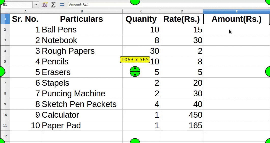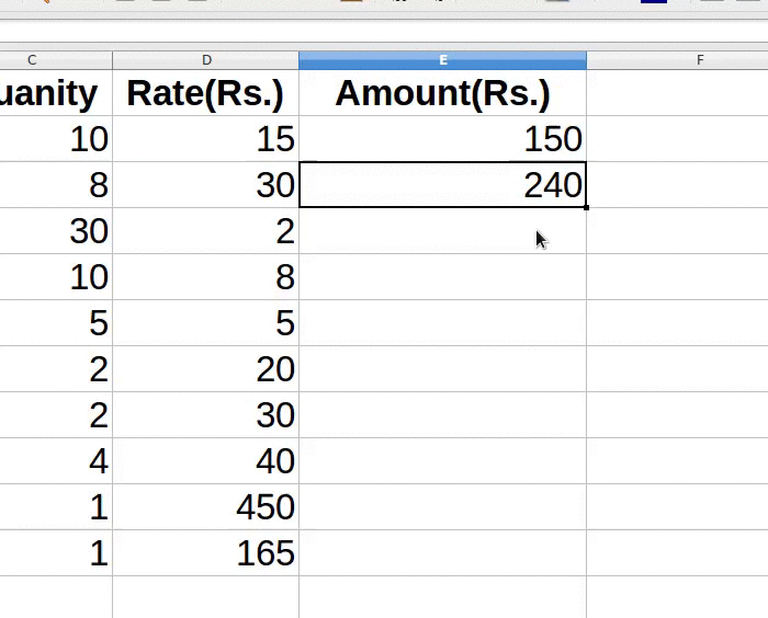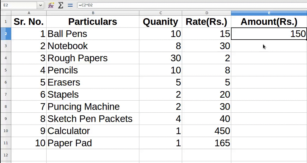 Now that we have entered values for columns Sr. No., Particulars, Quantity and Rate(Rs.), we have to enter values in the "Amount" column.