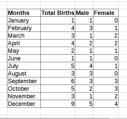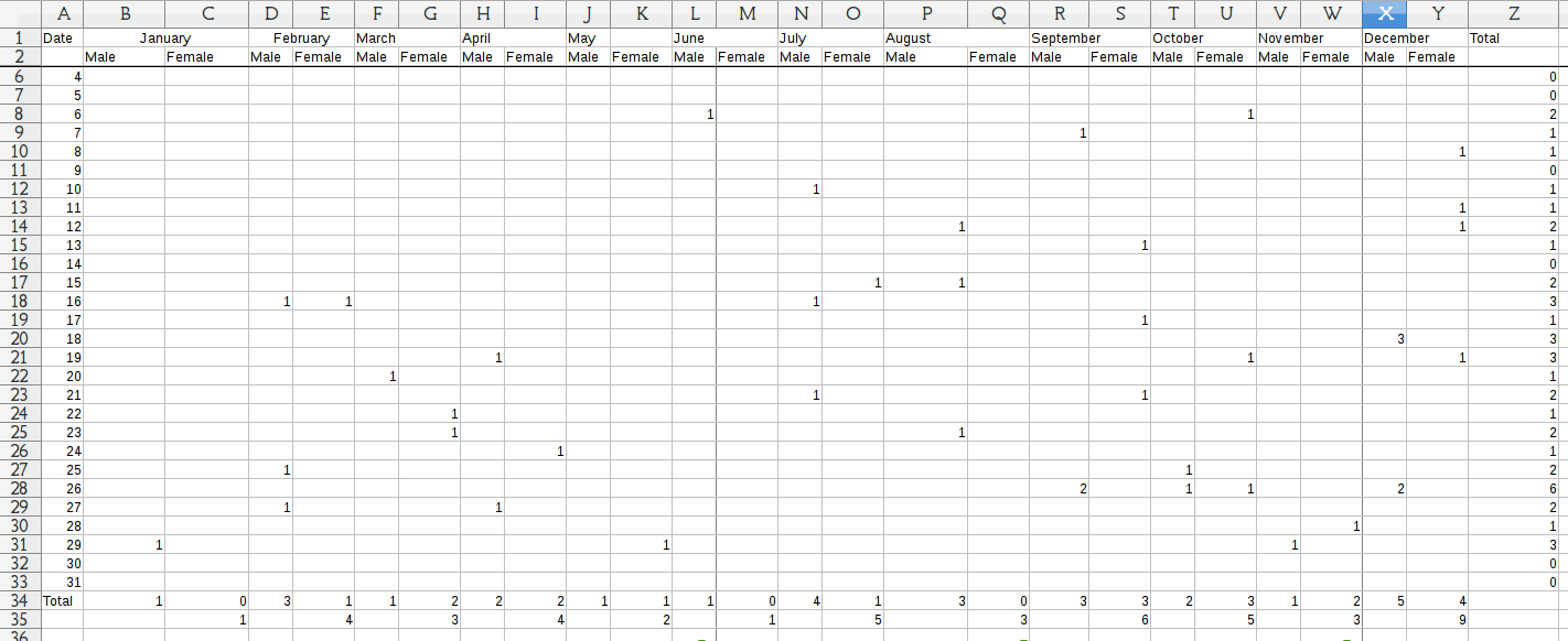 In this figure Total at the bottom left gives us Total births in that column. The total column at the right end gives us the total births on that day of the month. Please note that all values in the Total column are computed and are not entered by hand. Think about how you will achieve this.