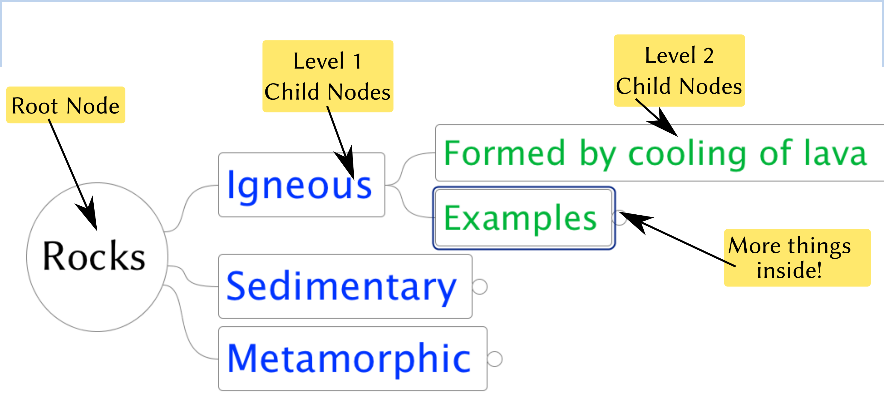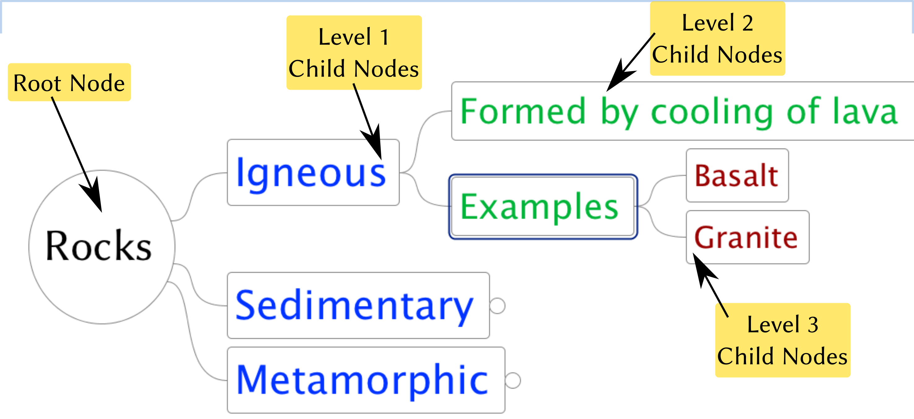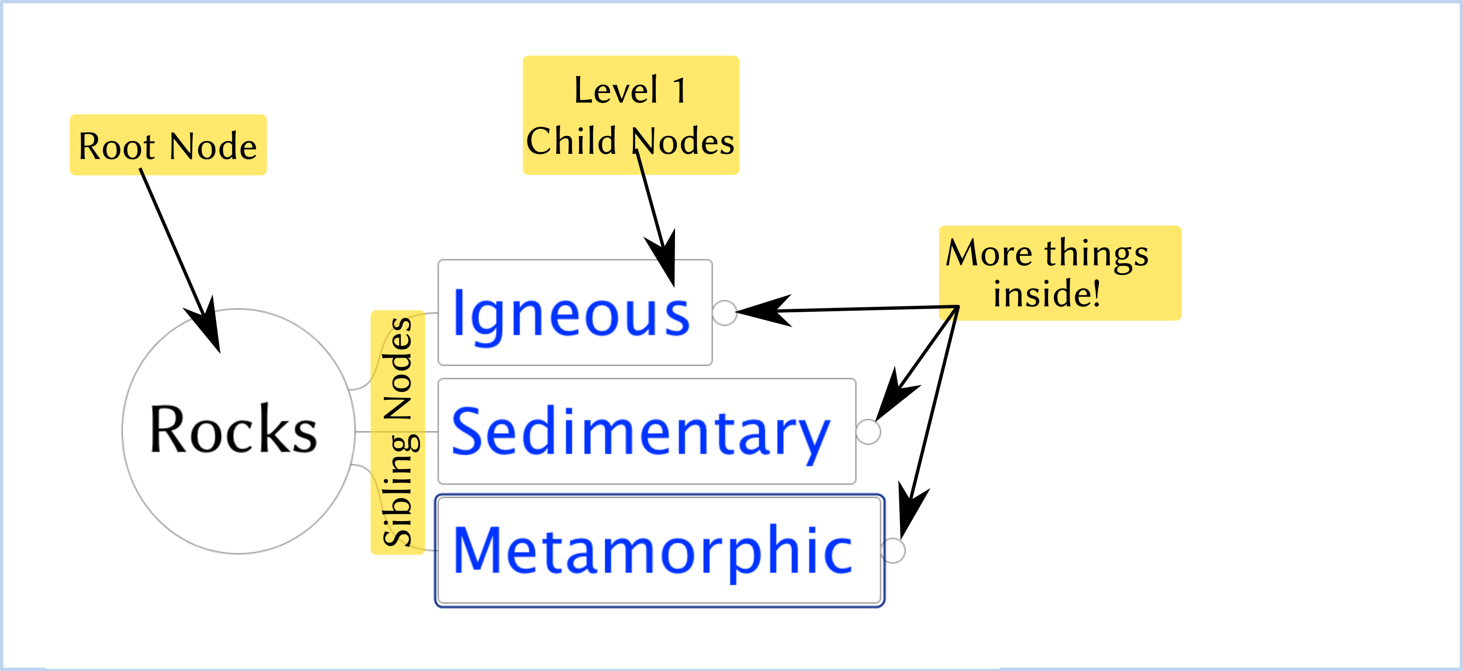 The three different types of rocks on the first level are the "child" or sub nodes of the central node.