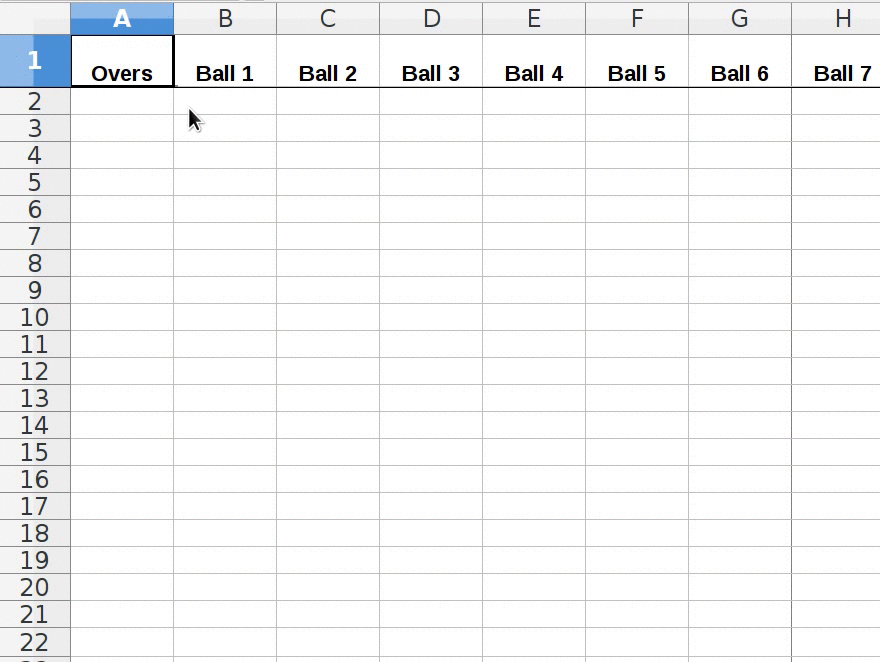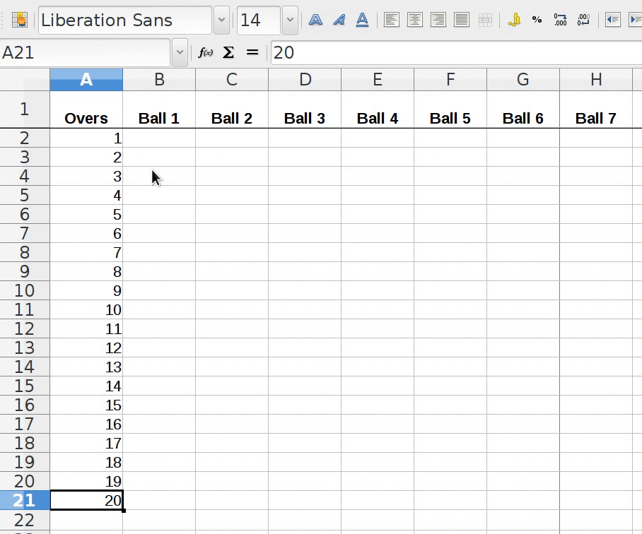 i2C > page > Making data entry into table > Table in a spreadsheet means, combination of rows and columns. Entering "over numbers" into "overs" column: Select the cell number "A2", enter number "1", which represents first over. After pressing "enter" button, again select the cell "A2", look for the tiny square, at the right bottom corner of the selected cell. Take your mouse pointer over that tiny square, and drag it, till row number "21". Since we need to insert data for 20 overs and first row is used for naming the columns, we need to use 21 rows. Make "over numbers" bold by selecting "Overs" column and press “Ctrl + B” key combination. [Contributed by administrator on 15. März 2018 15:02:07] × Tags calc help spreadsheet data entry 2-2 More Views Show no. of views Programs