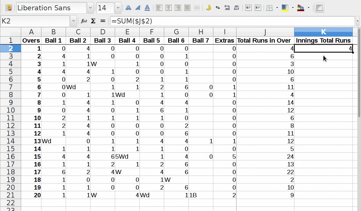 Add “=SUM(” then "$" then "J" and then ":" and "$"then "2" and bracket ")" complete, as innings total runs after 1st over
